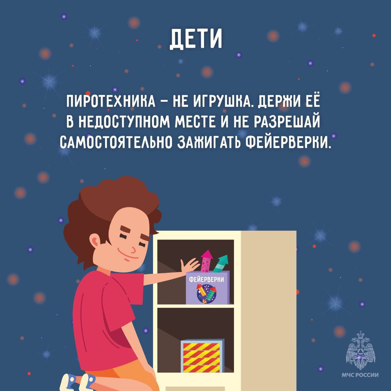 Ракетницы, петарды, фейерверки и салюты – самый коварный элемент новогодних праздников. Стоит запомнить, что покупать пиротехнические изделия нужно только в специализированных торговых точках. При покупке необходимо убедиться, что товар заводского изготовления, у продавца должен быть сертификат соответствия на приобретенный товар. Внимательно изучите инструкцию и строго следуйте ей, не давайте пиротехнику в руки детям. Реализация пиротехнических изделий запрещается лицам, не достигшим 16-летнего возраста. Неправильное хранение и эксплуатация могут привести к печальным последствиям.