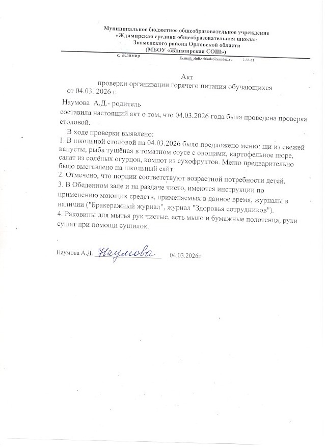 В целях формирования позитивного отношения к организации питания в школе у родительского сообщества, в декабре 2025 года в Ждимирской школе в школе прошел родительский контроль питания. В столовой имеется зона для санитарно-гигиенической обработки рук (горячая вода, жидкое мыло, сушилки, дезинфицирующее средство для обработки рук), работает рециркулятор. Имеется график приема пищи обучающимися.